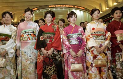 1月4日,在日本東京證券交易所,女職員身穿和服,慶祝2007年新年假期后第一個交易日的開始。2006年,東京股市日經指數累計上漲了6.92%,已連續4年保持上漲。