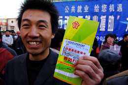 3月6日,寧夏“2007年度春風(fēng)行動(dòng)和再就業(yè)援助”活動(dòng)拉開帷幕,相關(guān)部門在啟動(dòng)儀式上為進(jìn)城務(wù)工人員代表發(fā)放了“醫(yī)保卡”,農(nóng)民工憑借此卡可享受醫(yī)保服務(wù)。圖為來(lái)自安徽的農(nóng)民工吳國(guó)旭在展示他領(lǐng)到的“惠民醫(yī)保卡”。
