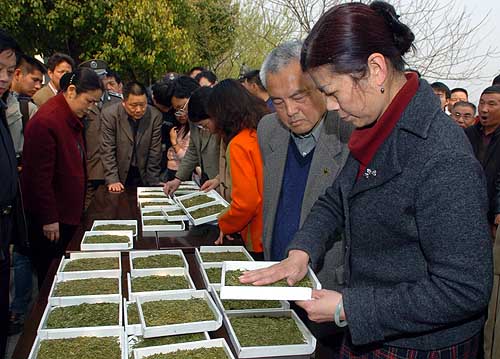 3月22日,茶葉專家正在現(xiàn)場(chǎng)查看剛剛炒制出來的西湖龍井茶的色澤。當(dāng)天,2007年西湖龍井炒茶技藝大賽在杭州舉行,30多位來自西湖龍井茶區(qū)的炒茶高手爭(zhēng)奪2007年“炒茶王”桂冠,比賽結(jié)束后,經(jīng)過專家組對(duì)茶葉色澤、香氣、湯味等指標(biāo)的嚴(yán)格評(píng)選,最后精選的200克極品西湖龍井“茶王茶”當(dāng)場(chǎng)被買家以11萬元的天價(jià)拍走。