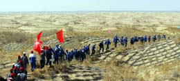 圖為排著長隊的寧夏銀川市學生走進毛烏素沙地參加義務治沙造林活動。