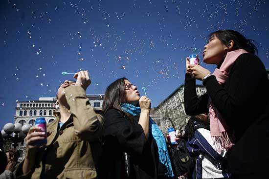 在美國紐約和俄羅斯首都莫斯科人們紛紛走上街頭吹起五彩的泡泡,享受春日的溫暖。