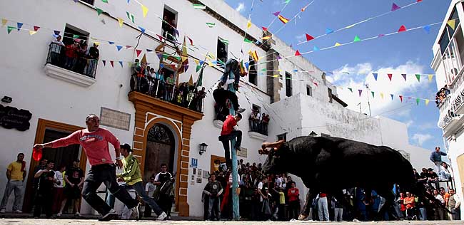 8日,在西班牙南部小鎮貝赫爾-德拉弗龍特拉,一名男子在一頭公牛前奔跑。當天是這個小鎮傳統的節日奔牛節,盡管它與著名的西班牙潘普洛納奔牛節規模不能相比,但是小鎮居民和游客仍對此節日充滿激情。
