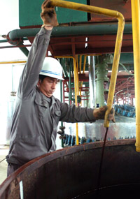 近日,江西新時代油脂工業(yè)有限公司創(chuàng)新工藝、自行設計生產(chǎn)的生物柴油生產(chǎn)線投產(chǎn),預計年生產(chǎn)能力可達1.8萬噸。這種創(chuàng)新工藝生產(chǎn)出的生物柴油可單獨或混合石化柴油供車輛使用。這種新工藝為廢油再利用提供了新出路。圖為工作人員在生物柴油生產(chǎn)線上操作。