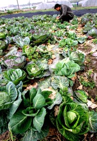 4月15日,上海浦東凌橋村菜農(nóng)趙偉種植的卷心菜像爆米花一樣展開,上市時(shí)只能剝?nèi)ト~子買菜基,價(jià)錢只有往年的1/4。據(jù)上海市氣象部門提供的信息,2006年冬季至2007年春季,上海氣溫較常年偏高,導(dǎo)致田間病蟲害增多,還使得“瘋長(zhǎng)”的蔬菜質(zhì)量下降、價(jià)格下跌。