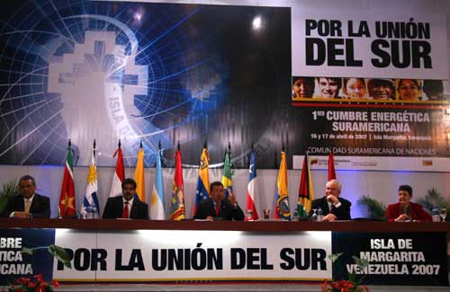 17日,在委內瑞拉東北部瑪格麗塔島的波拉馬爾,委內瑞拉總統查韋斯(中)在新聞發布會上通告會議成果。為期兩天的首屆南美國家共同體能源首腦會議當日在波拉馬爾閉幕。