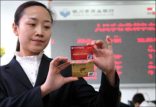 4月23日,銀川市商業(yè)銀行工作人員對比新舊銀聯(lián)如意借記卡。中國銀聯(lián)從7月1日起,將停止“94”字頭如意借記卡的跨行取款和刷卡消費業(yè)務。新卡片磁條信息上除了記錄持卡人的個人資料之外,還添加有CVN校驗碼,該校驗碼是防范克隆卡和偽卡交易的重要手段,可保護持卡資金安全。凡持“94”字頭的如意借記卡客戶須到銀行各網(wǎng)點免費更換新標準如意借記卡。