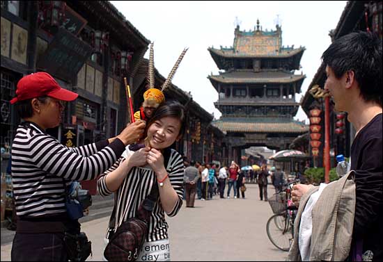 4月29日,在山西平遙古城南大街,一名游客準備和一只小猴子合影留念。隨著“五一”黃金周的來臨,山西省平遙古城迎來了眾多的游客,各個景點開始預熱,以迎接客流高峰的到來。