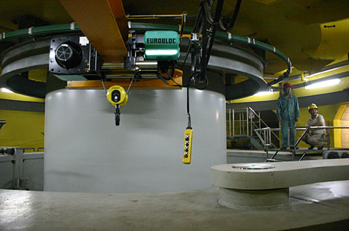 6月11日,工程技術人員在對率先投入運營的22號機組進行監測。當日,三峽工程右岸電站首臺機組——22號機組經過一個多月的調試運行,正式并網發電,投入運營。這標志著三峽三期工程開始發揮效益。