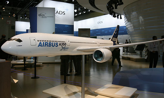 在剛剛閉幕的第47屆巴黎國際航展上,空中客車公司全面展示了從A320到A380各系列飛機,共獲得了425架確認訂單和303架承諾訂單,創造了新紀錄。這張拍攝于6月23日的照片顯示的是空中客車展臺展出的A350寬體飛機模型。