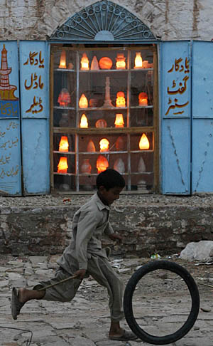 4日,一名男孩在巴基斯坦凱沃拉的一個鹽礦石工藝品櫥窗前玩耍。巴基斯坦的凱沃拉以其石鹽礦聞名,許多當地人以制作鹽礦石工藝品為生,一名工人每天的報酬平均為250盧比(約合5美元)。