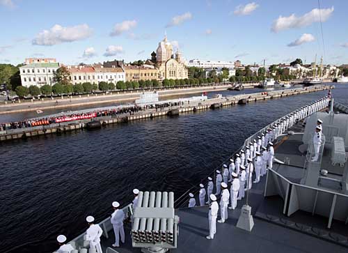 27日,中國海軍艦艇編隊抵達俄羅斯圣彼得堡市。由“廣州”號導彈驅逐艦和“微山湖”號綜合補給艦組成的出訪歐洲4國艦艇編隊,經過34天、1萬多海里的連續航行,27日抵達俄羅斯圣彼得堡,開始進行為期4天的友好訪問,并參加在這里舉辦的“中國年”活動。