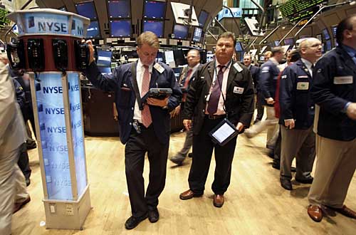 28日,交易員在美國紐約證券交易所工作。受一系列利空消息影響,紐約股市當(dāng)日全面下挫,其中道瓊斯指數(shù)重挫280.28點(diǎn)。