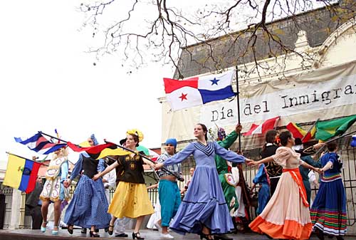4日,在阿根廷首都布宜諾斯艾利斯移民局前舉行的慶祝移民節活動上,演員們表演富有拉美和歐洲風情的舞蹈。當天,包括中國在內的30多個國家的移民社團參加了布宜諾斯艾利斯的移民節慶祝活動。