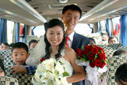 9月16日,參加“公交婚禮”的新人在公交婚慶車上接受親友祝福。當日,哈爾濱舉辦首屆“公交婚禮”,三對來自哈爾濱不同行業(yè)的新人參加了這次浪漫、環(huán)保的婚禮。據了解,這是2007年哈爾濱市城市公共交通周及無車日活動之一,旨在提倡節(jié)能減排,保護環(huán)境,拒絕浪費。