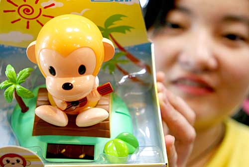 在安徽省淮北市一家商店,一位工作人員展示太陽能玩具。這種太陽能玩具的底座設(shè)有光線接收口,可以將陽光、燈光的光能轉(zhuǎn)換為電能,玩具會頻頻點頭,十分可愛,頗受消費者喜愛。