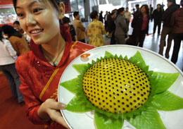 11月1日,一家參展企業的工作人員向參觀者介紹糧食制品“葵花餅”。