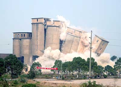 11月8日,江蘇溧陽市南渡鎮原強埠水泥廠內的機立窯水泥生產線群被爆破拆除。