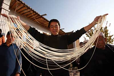 11月13日,循化縣新建村一位撒拉族青年在家中與朋友切磋拉面技藝。