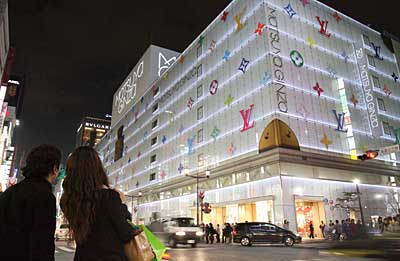 17日,在日本東京繁華的銀座商業區,松屋百貨大樓被用“路易·威登”的經典圖案裝扮成一只巨大的“路易·威登”旅行箱,以招徠顧客。