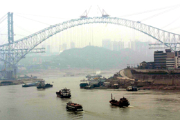 船只正從建設(shè)中的重慶朝天門長江大橋下通過(1月17日攝)。朝天門長江大橋?yàn)楣奋壍澜煌▋捎娩撓涮峄@拱特大橋,主拱跨度達(dá)552米。目前主體工程完成過半,建設(shè)進(jìn)展順利,該大橋預(yù)計(jì)在2008年內(nèi)建成通車。