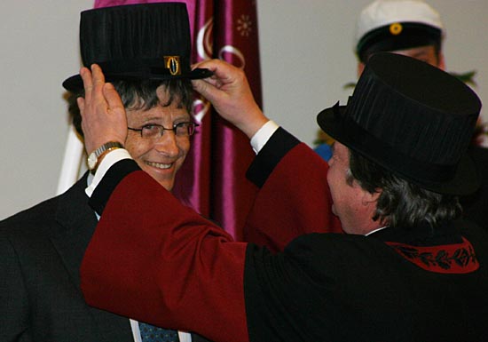 1月23日,在瑞典卡羅林斯卡醫(yī)學(xué)院舉行的儀式上,美國微軟公司董事長比爾·蓋茨戴上醫(yī)學(xué)榮譽博士帽。卡羅林斯卡醫(yī)學(xué)院去年12月20日宣布,授予比爾·蓋茨及夫人梅林達(dá)·蓋茨醫(yī)學(xué)榮譽博士學(xué)位。