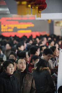 2月14日,應聘者在閱讀招聘信息。 當日,“2008年山西省春季大型人才招聘暨大中專畢業生就業洽談會”正式開幕。本次人才交流大會為期兩天,前來參加招聘會的用人單位包括上市公司、國有大中型企業、民營企業、高新技術企業以及大中專院校、科研院所等共300余家,提供約8000多個工作崗位。據了解,約有包括應往屆大中專畢業生在內的各類社會求職者1萬2千人前來應聘。另外,根據人事部等部門的相應要求,山西人才市場對所有應聘者一律免收入場費,求職者信息免費登記并錄入人才信息庫。 |