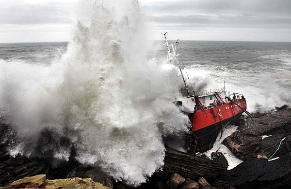 11日,在西班牙比斯開省附近的海灣,巨浪拍打著岸邊的一艘商船。一場強暴風雨近日席卷了英倫三島和歐洲大陸西部的一些國家,造成許多地方交通受阻、供電中斷,并有人員受傷。新華社/路透
