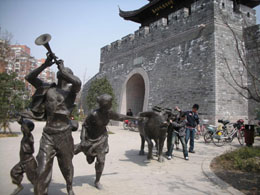 近日,杭州市人民政府對古城墻古城門進行了搶救性發掘與保護,并在古慶春門遺址上恢復建設起古城墻與城門陳列館,免費向市民開放,形象性地再現了杭州古城發展歷史。圖為在城墻外玩耍的年輕人.