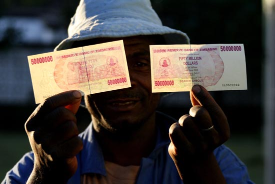 5日,一名津巴布韋人在首都哈拉雷展示新發(fā)行的5000萬(wàn)津元紙幣。津巴布韋中央儲(chǔ)備銀行宣布,從4日起發(fā)行當(dāng)今世界貨幣中面額最大的5000萬(wàn)津元紙幣,以緩解目前津巴布韋市面上的現(xiàn)金短缺問(wèn)題。目前津巴布韋的通貨膨脹率達(dá)到100000%。