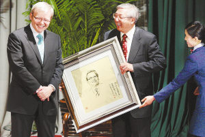 4月9日,澳大利亞總理陸克文在北京大學用中文發表演講,并回答了北大學生的提問。演講后,北京大學校長許智宏向陸克文贈送了北大教師為他作的畫像。趙青