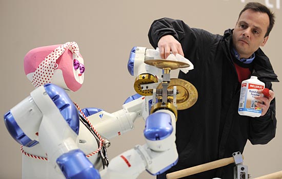 20日,一名參展人員在德國漢諾威的展覽場館內擦拭機器人。德國2008漢諾威工業博覽會于4月21日至25日在這里舉行。來自世界約60個國家和地區的5100多個參展商將參加這次工業博覽會。新華社/法新