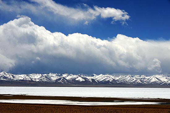 藏北草原上美麗的納木湖及念青唐古拉山脈(4月16日攝)。