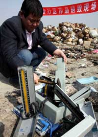 3月18日,工作人員用鐵錘砸毀不合格血壓儀。當日,山西省運城市鹽湖區將在打擊非法行醫活動中沒收的520箱問題藥品、100多件劣質醫用器材進行集中銷毀,確保群眾的用藥就醫安全。
