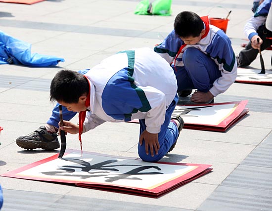 4月24日,山東滕州實驗小學學生參加百名學生書法陣彩排,迎接5月中旬在滕州舉辦的墨子文化節。中國首屆國際墨子文化節將于5月16日至18日在山東滕州舉行。