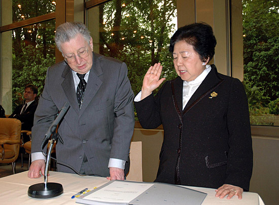 20日,中國律師張月姣(右)在日內瓦世界貿易組織總部宣誓,正式就任世貿組織上訴機構法官。上訴機構是世貿組織負責貿易爭端裁決的最高機構,由7名法官組成。這是中國內地律師首次在世貿組織中擔任這一重要職務。