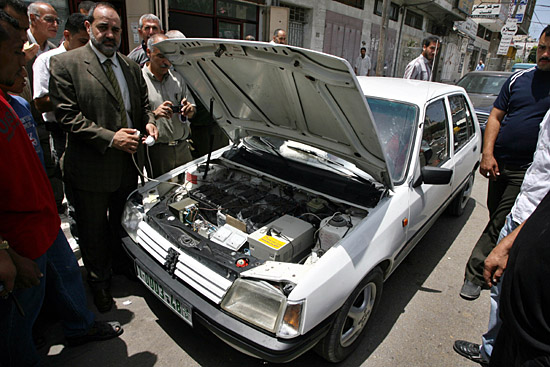 21日,在燃料緊缺的加沙地帶,人們圍觀一輛由法耶茲·安曼(前左)等當?shù)仉姎夤こ處煿餐O(shè)計的電動車。這輛車充電一次可以行駛200公里。
