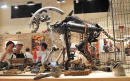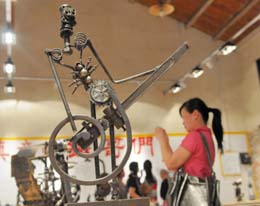 一場以“創意與環!睘橹黝}的環保鐵藝秀日前在浙江嘉興開展,參展作品主要由從廢品收購站“淘回”的廢舊零件打造而成,讓人耳目一新。圖為參觀者欣賞環保鐵藝作品。