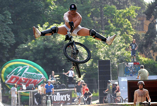 1日,第四屆“激浪城市噪音”自行車特技巡回賽在羅馬尼亞西部城市蒂米什瓦拉開帷幕。這是一名選手正在展示車技。新華社/羅新社
