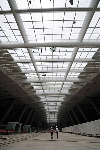 北京南站日前進入工程收尾階段,預計于6月30日竣工,7月中旬完成系統調試,8月1日正式開通運營。新南站總建筑面積42萬平方米,是集鐵路、地鐵、公交等于一體的大型綜合交通樞紐。它將成為城際列車和客運專線等快速列車在北京到發的客運站。圖為北京南站候車室。