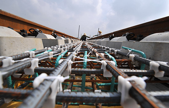 6月19日,施工人員在武廣客運專線調試試驗鐵路枕軌。