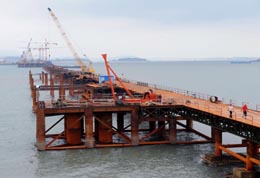 全面貫通的福建省平潭海峽大橋施工棧橋。福建平潭海峽大橋自2007年11月開工建設以來,經過600多名建設者日夜奮戰,大橋施工用棧橋于近日全線貫通,進入主橋橋墩海底施工階段,這標志著大橋主體施工進入快車道。總投資為11億多元,建設工期3年的平潭海峽大橋地處福建東部,連接內陸福清市與福建第一大島嶼——平潭島,大橋全長3500米,設計為雙向4車道,是進出平潭島的最便捷通道。