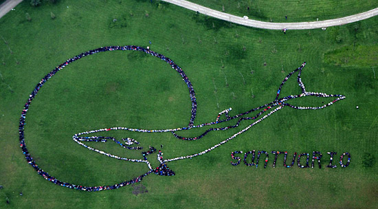 22日,人們在智利首都圣地亞哥的一片草坪上組成鯨魚的形狀和西班牙語“保護區”一詞的字樣。國際捕鯨委員會將于6月23日至27日在智利召開會議,再次就是否維持商業捕鯨禁令問題進行討論。新華社/法新