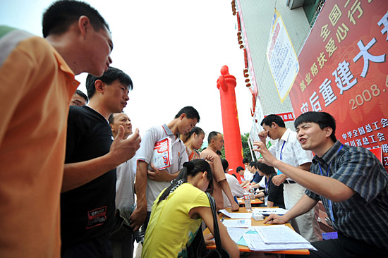 6月29日,一家用工單位的工作人員(右)在向受災群眾介紹單位情況。當日,中華全國總工會開展的“全國工會就業幫扶愛心行動”在四川綿陽市惠民幫扶中心正式啟動,來自天津、江蘇、浙江、福建、廣東5個省市的工會和近800家企業為四川災區帶去8萬多條崗位信息。