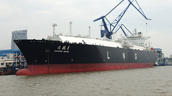 7月10日,中國第二艘液化天然氣(LNG)船“大鵬月”在上海交付船東,這是滬東中華造船(集團)有限公司繼今年4月3日成功建造中國第一艘液化天然氣(LNG)船后的又一成果。這是“大鵬月”船停靠在黃浦江碼頭。