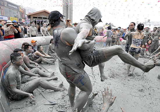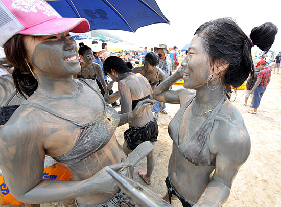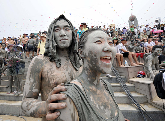 在韓國保寧大川海水浴場舉行的泥漿節上,游客們在泥漿中嬉戲。保寧每年舉行泥漿節吸引游客,游客可以將泥漿涂抹在身上美容護膚。新華社/法新