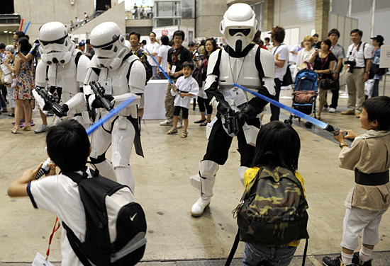21日,在日本幕張舉行的“《星球大戰》日本慶典”活動上,幾名兒童與《星球大戰》中的角色克隆人“對戰”。新華社/法新