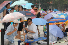 7月24日中午,在北京奧林匹克中心區(qū)奧運(yùn)門票售票點(diǎn),市民們冒著酷暑排隊(duì)等候購(gòu)買奧運(yùn)門票。 北京奧運(yùn)會(huì)最后82萬(wàn)余張比賽門票將于7月25日起通過(guò)設(shè)在各奧運(yùn)場(chǎng)館的售票亭面向公眾發(fā)售,其中有25萬(wàn)張是北京地區(qū)的比賽門票,其余均為在上海、天津、沈陽(yáng)、秦皇島舉行的足球比賽門票。為買到門票,部分市民從23日中午就開始在奧運(yùn)門票售票點(diǎn)排隊(duì)等候。 |