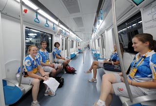 7月28日,來自美國的志愿者乘坐奧運支線返回住處。當日,北京地鐵奧運支線開始載客試運營。奧運支線全長4.5公里,共設有4座車站,自北向南分別是森林公園南站、奧林匹克公園站、奧體中心站和北土城站。