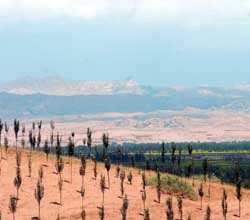 這是柴達木盆地香日德綠洲附近的一處新栽植的楊樹(8月10日攝)。青海省都蘭縣是全國高海拔治沙試驗區,在楊樹深栽造林試驗方面取得成功,并用此技術造林近3萬畝,為柴達木盆地生態筑起了一道綠色屏障。