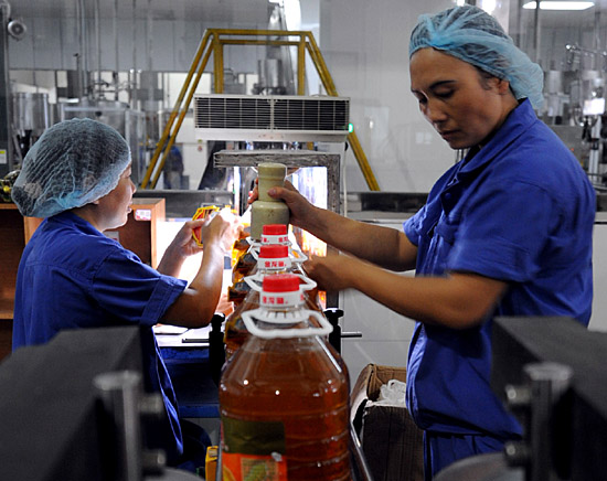 近年來,隨著以進口大豆為原料的加工企業的陸續落戶,北部灣已成為國內大豆加工新基地。目前,分布在廣西沿海的大豆加工數量約占全國比例的15%。圖為廣西防城港市“大海糧油”的員工在生產食用油。